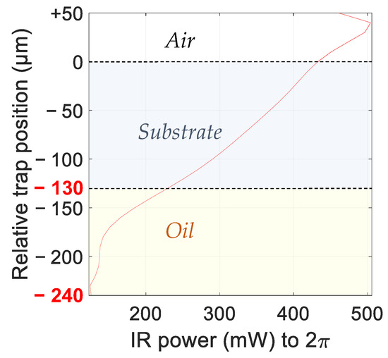 If the power–phase ratio were to remain constant in the different media, then no medium responsible for generating the additive phase could be identified. However, the results presented in the graph in Figure 4 provide evidence that by placing the trap in the immersion oil, the phase addition is more sensitive to the change in power when compared to the slide glass and the medium in which a sample would be immersed over the slide, which in this case was air. It is observed how less power is required to cause a phase shifting of when the trap is placed in the oil (between −130 and −240 µm).