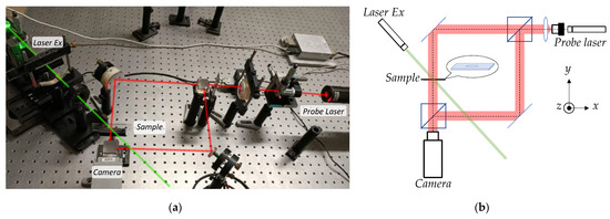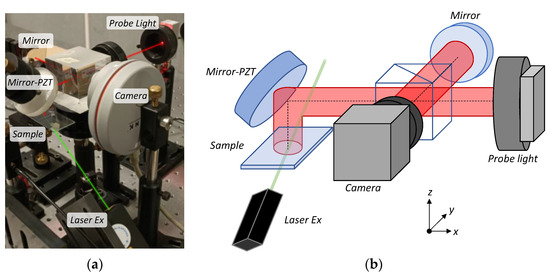 Mach–Zehnder interferometer used to study refractive indexes: (a) experimental setup photo; (b) Scheme.