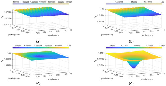 Change in the refractive index when laser radiation excites: (a) Air; (b) Glass; (c) Distilled water; (d) Immersion oil.
