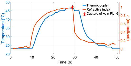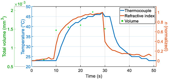 Figure 11 plots the thermocouple measurements as a function of time and compares them with the optical phase map maximum value corresponding to the refractive index. It is observed that in both cases, the oil gets excited and relaxes at approximately the same time intervals, whereas in this case, the thermocouple is slower to react to the change. It is important to mention that the oil returns to its initial temperature and refractive index in less than 20 s.