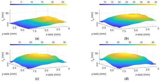 Here, is the background signal, is the modulation signal (or fringe contrast), is a phase carrier, and, for simplicity, the phase difference term of interest will hereafter be referred to as . If the term is known, a system of at least three equations is necessary to determine , due to the infinite possibilities in the other parameters; in practice, it is common to introduce a variation that can be a sequential increase of (also called “phase shifting” or “phase step”), being the total number of fringe patterns [29]. It is important to note that only indicates the instant at which the phase shifting is applied; it is not directly related to a specific time.