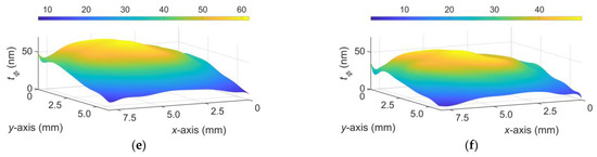 In Figure 13, the change in the surface topography of the exposed oil at different times is presented. Figure 13a shows the displacement map when measured at 5 s, when the laser was still off; Figure 13b shows measurement at 10 s, when the laser was turned on; Figure 13c–e represents measurements made at 15, 20, and 25 s, respectively; finally, Figure 13f corresponds to the topography measured when the laser was off.