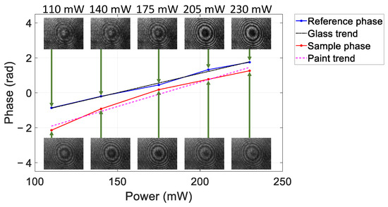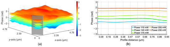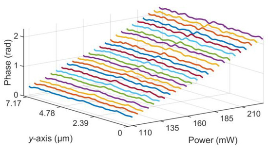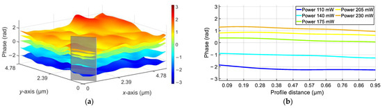 However, as demonstrated in Section 3.1.1, phase distribution may not be constant throughout the field of observation; so, it is advisable to consider such effects when implementing the calibration. For example, Figure 16a shows the phase behavior when applying powers of 110, 140, 175, 205, and 230 mW, in a slide area where there is no sample (i.e., without paint). Likewise, in Figure 16b, the profiles of the gray plane in intersection with the phase maps are plotted, as they are indicated in Figure 16a. Since the behavior between phase and power is linear, only these powers were selected to facilitate visualization. In both figures, it is clear that the additive phase intervals are equispaced, although spatially variable.