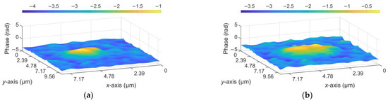 With the data presented here, it can be established that the additive phase piston detected in the optical trap is a consequence of changes in the immersion oil. Although in Section 3.1.1 (Figure 6d), the refractive index shows a Gaussian behavior, in Section 4.1 (Figure 16 and Figure 17), a quasi-constant phase shifting appears throughout the field of view, due to the difference of orders of magnitude of the observed areas (mm and µm, respectively). This phase piston is attributed to a thermal effect caused by laser radiation when transmitted through immersion oil. Although the oil’s morphological change (volume) does not usually affect the experiment directly, because it does not touch the sample under test, the change in temperature implies a variation in the refractive index and indicates an alteration in the beams focal point at the exit of the immersion objective used. In the experiments described in Section 3.1.1 and Section 3.2, the effect of a specific wavelength was analyzed, this was only to understand the oil behavior; if other wavelengths were used, it is suggested that there would be similar results, but with different ratios. Also, the results could vary with a focused beam instead of the collimated beam used in those experiments. However, the calibration and phase correction were done with the trap’s IR laser. In the case of a proper digital correction, the laser characteristics and the oil response to its exposure must be known.