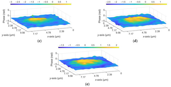 It can be clearly observed how there is a piston in the phase maps in the characterization of a sample as the IR laser power is increased. Figure 19a–e present in phase the damage that the sample receives when the IR laser is positioned at the glass–air interface, and the sample is characterized at powers of 110, 140, 175, 205, and 230 mW.