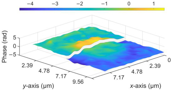 Since the applied power for each damage caused to the paint is known, then it is possible to remove the corresponding additive phase from the calibration presented in the reference of Figure 18. If the additive phase map of the calibration is constant, it will be enough to also remove that constant value from the phase map of the measured three-dimensional form; in this case the damage caused by the optical trap. If the additive phase map were not constant, then a correction should be implemented by relating both phase maps, point to point. Figure 20 shows the Figure 19d phase map; from 0 to 4.78 µm corresponds to the uncorrected phase and the half from 4.78 to 10.27 µm is the corrected measurement. It can be observed, in the corrected half, how the area of the paint that has not been damaged by the optical trap remains with values close to those in Figure 19a. It is expected that the correction in each of the other phases will behave in the same way.