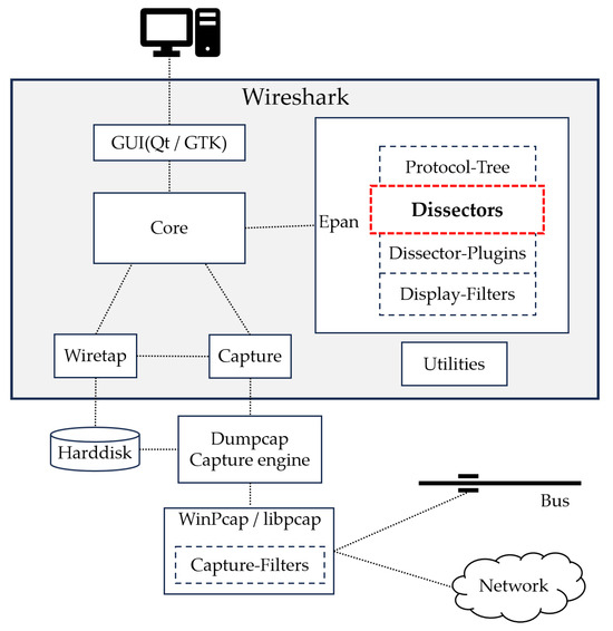 https://github.com/wireshark/wireshark/tree/master/, accessed on 10 March 2024). Each dissector can parse data packets of a specific protocol and fill the parsing results into the protocol tree. Through Dissector-Plugins, Wireshark can flexibly extend its parsing capabilities, allowing users to add new protocol dissectors or improve existing dissectors to better adapt to the changing network communication environment.