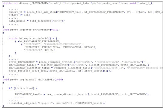 The dissector framework consists of three parts: “proto_register_PROTOABBREV”, “proto_reg_handoff_PROTOABBREV” and “dissect_PROTOABBREV”, as shown in