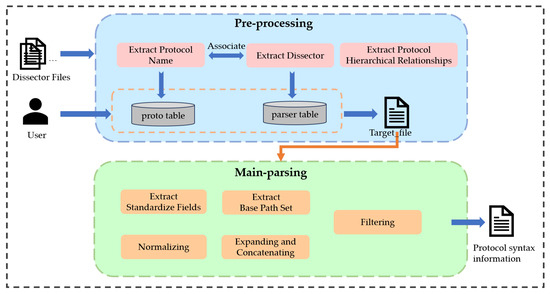 The pre-processing module is responsible for the preliminary processing of all Wireshark protocol dissector files, including extracting all protocol names and protocol dissector information, and generating protocol tables and parser tables for subsequent retrieval of target protocols and related dissectors. At the same time, the pre-processing module can extract the hierarchical relationship of multi-layer protocols and support the generation of multi-layer protocols for complete network data packets. The main-parsing module conducts an in-depth analysis of the protocol to be processed and extracts all packet types of that protocol, all field information that makes up each packet type, and the dependencies between fields.