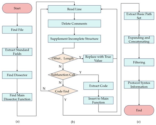 The extraction system first investigates each Wireshark dissector file to locate the protocol registration function according to Wireshark’s protocol registration mechanism and then extracts the protocol name and protocol handle from it. The protocol name, protocol handle, and associated protocol dissector file name are stored in a data structure called “protocol table”. Subsequently, the extraction system locates all dissector registration functions and extracts all dissector names, each dissector’s main parsing function and related protocol handle from the dissector file, and then the dissector information is associated with the related protocol according to the protocol handle. The dissector information and its associated protocol name are stored in a data structure called “parser table”. The purpose of the association is that in some dissector files, there may be several protocol-dissector pairs, for example, in the “packet-mbtcp.c” dissector file, there are several dissectors including “mbtcp” and “mbrtu” that are associated with “Modbus TCP” and “Modbus RTU” protocol each. By establishing this association, each protocol and its corresponding dissector can be accurately found by accessing the protocol table.