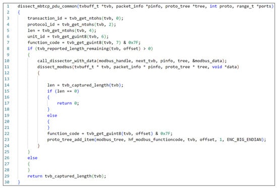 Figure 5 is a piece of Modbus TCP dissector code, we use it to illustrate the basic block partitioning process. Lines “3–7” of the code form an ordinary basic block, lines “8–28” form a branch basic block, lines “8–25” and lines “26–28” form two branch item basic blocks, each of line “17” and line “29” is a function return basic block, line “30” is a function end basic block.