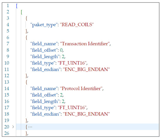 Figure 8 is a part of syntax information output results which is acquired by using our method over the Modbus TCP protocol. The structure in line “2” represents a data packet type, which contains all the component fields of the data packet type “READ_COILS” and detailed attribute information of each field.