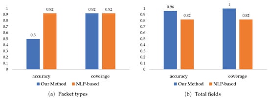Figure 9a, although our method is slightly lower in the accuracy metric than the NLP-based method, it can acquire more comprehensive packet type information which not only includes the packet type names, but also the component fields of each packet type. As shown in