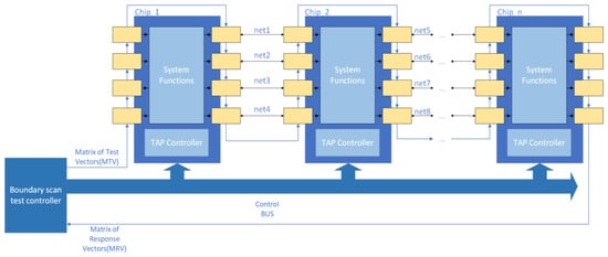 The process of interconnect test of the integrated circuit system by boundary scan technique is injecting MTV (matrix of test vectors) and reading MRV (matrix of response vectors), by comparing the difference between them to carry out the fault diagnosis process. A schematic of the structure of the boundary scan test is shown in Figure 3. This architecture is proposed by IEEE1149.1 standard, which is based on JTAG (Joint Test Action Group) interface and BSC (Boundary Scan Cell) []. The TDI and TDO ports of the JTAG interface of the chip under test are connected in the form of daisy chain. During each test, the test vectors move into the boundary scan test unit through the TDI serial of each chip, motivating the corresponding pins. After the excitation, the response vectors are displaced from the TDO port of the chip. The whole testing process is controlled by TCK and TMS signals in the form of a bus.