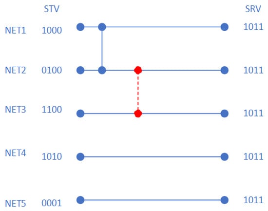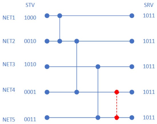 Confusion: When the result of wired-AND of a group STVs is the same as the result of wired-AND of another group STVs (There is no overlap between them). It is not possible to judge whether there is a short-circuit failure between these two groups of networks. At this point, a confusion has occurred on the MTV. As an example, shown in Figure 5, the result of wired-AND of the STV injected into net1, net2, and net4 is the same as the result of wired-AND of STV injected into net3 and net5, when a short-circuit fault occurs between net1, net2, and net4, and a short-circuit fault occurs between net3 and net5. Testers cannot determine whether the first group of nets have a short-circuit fault with the second (as shown by the red dotted line), so the confusion occurred.