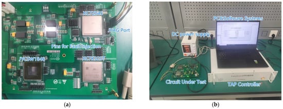 To test our method’s optimization for , this paper used Particle Swarm Optimization Algorithm (PSO), Walk-1 Algorithm, and our method to generate MTVs, and used them to carry out the boundary scan test on the same module under test which is developed by our laboratory. In this test, this paper set the relative error of estimated value of lower than 10%. The module under test is shown in Figure 7a; it consisted of 3 ICs, including an XC7K325T FPGA, an XC7Z045 FPGA, and a JYCSW1848 CPU. All chips are powered by power modules that allow them to work properly. The circuit under test contains a total of 123 networks and 371 pins. A total of 158 pins of those ICs are connected to the headers, so that testers can inject the shorted-circuit fault they need by using jumper cable to connect the pins of the networks. There are 87 testable networks, covering 71% of all networks. By connecting the JTAG port of the module to our boundary scan test system, which is shown in Figure 7b, testers can do a boundary scan test on it with MTVs generated by this paper.