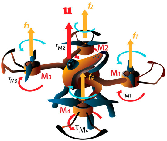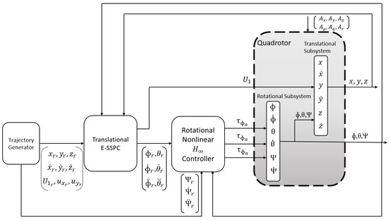 In order to obtain traction trajectories for the Quadrotor, it is necessary to combine the factors: controllability under the influence of external noise, uncertainty parameters, and dynamic modellessness. The proposed control strategy based on the distributed structure of the Quadrotor [27] is shown in Figure 4 below.
