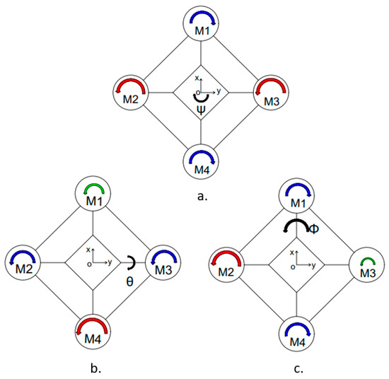 Assuming that the front and rear propellers rotate counterclockwise while the right and left propellers rotate clockwise, the control of the Quadrotor involves managing the speed ratio between these four propellers. During takeoff (throttle up) and landing (throttle down), all four propellers must generate an equal thrust to achieve a combined force greater or less than gravity. To adjust the roll angle Φ, which involves rotating the Quadrotor around the axis formed by the front–back motor pair, the speed difference between the right and left propellers is varied while maintaining the same thrust produced by this pair. Similarly, to control the pitch rotation θ, which involves rotating the Quadrotor around the axis formed by the right–left motor pair, the speed of the front and rear propellers is adjusted while keeping the total thrust constant. The yaw angle Ψ, which entails rotating the Quadrotor around an axis perpendicular to the plane containing all four rotors, is achieved by changing the speed difference between the front and rear propellers, as well as between the right and left propellers while maintaining the total thrust. This allows the Quadrotor to maintain its original altitude (Figure 2).