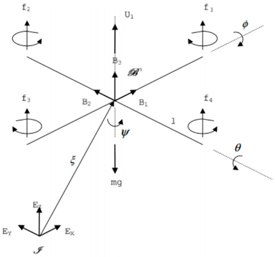 The Quadrotor-type UAV (referred to as Quadrotor) is a flying device belonging to the helicopter type, with four propellers located in the same plane and equipped with four engines placed symmetrically through the center of the cross (Figure 1). The four propellers are identical in size, with two identical pairs, a pair of reverse blades, and a pair of forward blades interlaced in a clockwise rotation with the Quadrotor center as the center of rotation. The engines are also designed in the same way and operate so that two opposite blades rotate in the same direction, and two adjacent blades rotate in opposite directions to balance the torque generated on the frame.