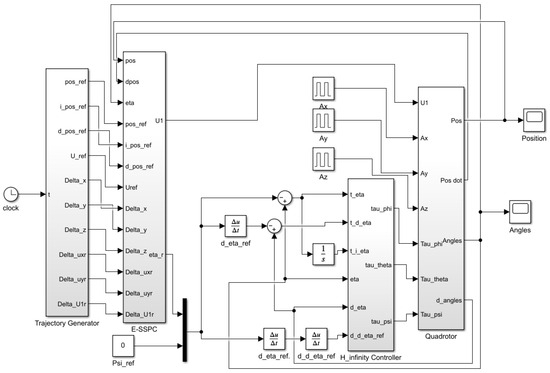 In conclusion, the research advances Quadrotor UAV control systems by introducing a highly sophisticated controller that harmonizes an optimal H∞ controller with an integral predictive controller, further augmented by the implementation of a Kalman filter. The control architecture is ingeniously layered, with the state–space predictive controller operating in the outer loop to maintain the set trajectory and mitigate system noise. The integral component of the predictive controller is pivotal in enhancing trajectory tracking and noise resilience, ensuring the system’s robust response to environmental disturbances.