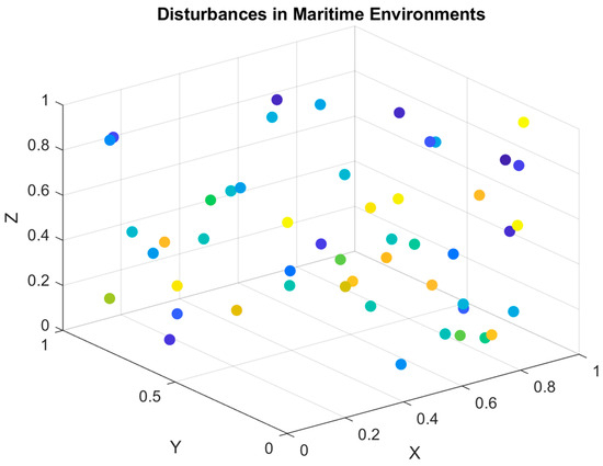 Quantitative metrics are used to compare controller performance across sea states. These include the Integral of Time-multiplied Absolute value of Error (ITAE), Integral of Squared Error (ISE), and maximum position/attitude errors. Trends in these metrics indicate the controller’s ability to reject disturbances of increasing magnitude. The following is a simulation of the disturbance and the proposed controller when operating under the influence of the proposed disturbance (Figure 12 and Figure 13). The simulation presented was conducted with the input signal set to 1, and the parameters of the LQR controller were referenced from document [48].