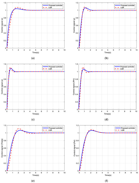 Comparison of the control of velocities of two LQR controllers and proposed controllers. (a) Control signal (x); (b) control signal (y); (c) control signal (z); (d) control signal (phi); (e) control signal (theta); (f) control signal (psi).