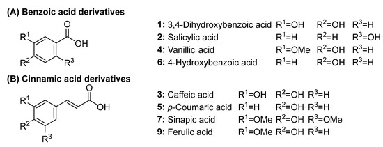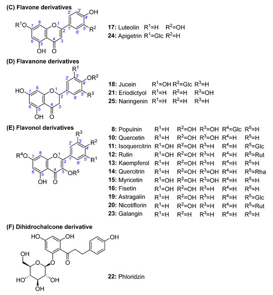 Among detected phenolics, four consisted of hydroxylated derivatives of benzoic acids (3,4-dihydroxybenzoic, salicylic, vanillic, and 4-hydroxybenzoic acid) (Figure 1A); four were cinnamic acid derivatives (caffeic, p-coumaric, chlorogenic, and ferulic acids) (Figure 1B); two were flavone derivatives (luteolin and apigetrin) (Figure 1C); and three were flavanone derivatives (juncein, eriodictyol, and naringenin) (Figure 1D). The largest group was the flavonol derivatives, with eleven compounds (populnin, quercetin, isoquercitrin, rutin, kaempferol, quercitrin, myricetin, fisetin, astragalin, nicotiflorin, and galangin) (Figure 1E). Finally, a dihydrochalcone glucoside was also detected (phloridzin) (Figure 1F). Anthocyanins, usually found in blackcurrant and redcurrant pomaces, such as delphinidin-3-glucoside and cyanidin-3-glucoside [4], were not found, which was due to the fact that the analyzed material only included seeds and no other fruit tissues where such compounds occur. However, some authors reported low quantities of anthocyanins (3−6 mg/100 g), such as delphinidin and cyaniding glycosides, in black currant seeds (e.g., [9]), which can be due to an incomplete removal of pulp tissues from seeds.