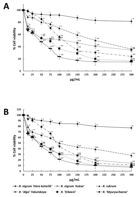 To determine the in vitro antiproliferative activity, we selected blackcurrant cultivars from Yakutia since their seed oils showed a high content of GLA [7]. A sample of red currant (R. rubrum) was also checked for comparative purposes since it is a widely cultured and commercialized berry. Previously, the antitumor activity of phenolic extracts from fruits and leaves of Ribes species has been studied. For instance, the apoptotic effects and mechanisms of blackcurrant extracts in MKN-45 (human gastric adenocarcinoma) and TE-1 (human esophageal cancer) cells were assessed. It was reported that such extracts induced caspase-dependent apoptosis through the downregulation of Bcl-2, a mitochondrial pathway involving the activation of p38 (mitogen-activated protein kinases) and JNK (c-Jun N-terminal kinase) and the inactivation of Akt (a central kinase that controls diverse processes, including cell survival and apoptosis). Thus, such an extract has been proposed as a potential candidate for cancer therapy [31]. However, the antitumor activity of phenolic-rich seed extracts of any Ribes species remains unchecked.