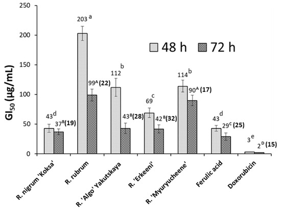 MTT assay. GI50 after HT-29 cell exposure for 48 and 72 h to seed extracts, as well as ferulic acid and doxorubicin (positive control). The GI50 value is detailed over the columns, and the SI for 72 h exposed cells to seed extracts is shown in parentheses. Data represent the mean of three complete independent experiments ± SD (error bars). In a bar, means followed by different lower-case letters (for 48 h treatment) and capital letters (for 72 h) are significantly different at p < 0.05.