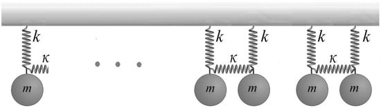 By introducing an internal linear coupling term, , within the resonators illustrated in Figure 2, the system evolves into internally coupled resonators. This transformation creates an environment where the displacements of the resonators are no longer independent but are coupled. Specifically, the displacement of one resonator influences the displacement of the other, establishing a dynamic interaction. The energy associated with this coupling is quantified by the coupling potential energy, in which each pair of resonators (1 and 2, 3 and 4, 5 and 6, etc.) forms a system with two degrees of freedom: . The equations for the coupled oscillator system can be formulated as follows: