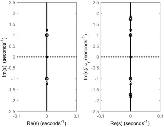 Now, leveraging the transfer function method enables the utilization of the well-known root locus analysis. By considering the modal response as the closed-loop transfer function of a negative feedback system, which incorporates a proportional feedback gain of , and defining the feedforward transfer function as , as specified in Equation (34), one can observe this interpretation.
