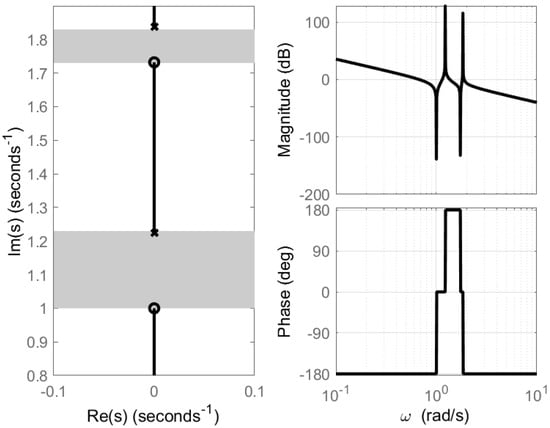 As mentioned earlier, the introduction of in the coupled system leads to additional zeros and poles, as evidenced by the second root locus in Figure 4. This modification is characterized by the resonant frequencies and , suggesting the emergence of a second bandgap. Moreover, the root locus plot in Figure 4 (left) indicates that the internal coupling parameter influences the system’s pole trajectories. Conversely, the Bode plot (right) reveals a pronounced resonant peak, suggesting an increased selective sensitivity to certain frequencies. While the phase response indicates the overall system’s stability under the new coupling condition, it must be carefully evaluated to ensure robustness, especially in control applications where stability is critical.