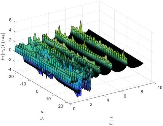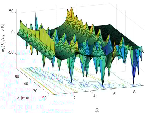 The transfer function presented in Equation (33) incorporates coupling effects through the parameter, allowing for the interaction between multiple resonators, denoted as and . This interaction can lead to complex dynamic behavior, including the potential for multiple bandgaps or more pronounced resonant effects. The integration of damping elements for both the plain structure and the resonators can be conveniently executed at this stage.