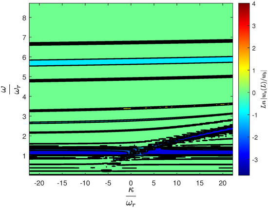 Figure 8 presents a contour plot of the transmittance across the metastructure as a function of the normalized internal coupling strength, , and normalized frequency, . The color gradient represents the logarithmic scale of transmittance, indicating the level of wave attenuation within the metastructure. Dark regions correspond to high attenuation levels, signifying the presence of bandgaps. As observed, the contour lines delineate the boundaries of the bandgaps, which become more distinct with specific values of internal coupling strength. This visualization provides a comprehensive understanding of how internal coupling affects the bandgap frequencies, offering insights into the precise tuning of the metastructure’s vibrational properties. It can be seen that the emergence of additional bandgaps occurs within certain ranges of , demonstrating the metastructure’s sensitivity to variations in internal coupling. The plot serves as a detailed map for predicting the dynamic behavior of the metastructure under varying conditions of internal coupling, which is critical for applications requiring targeted vibration isolation frequencies.