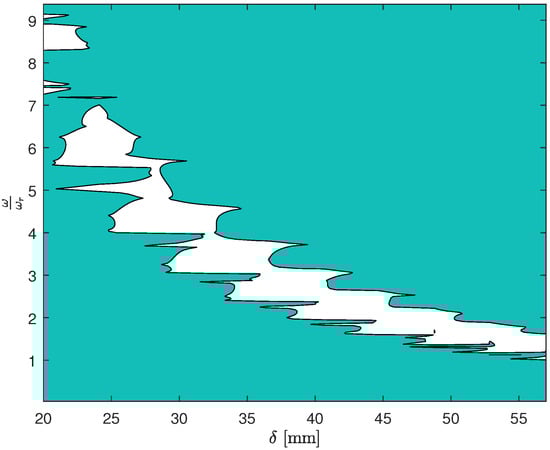 The contour plot depicted in Figure 10 utilizes a binary representation to mark regions of transmittance reduction, set at . The provided binary representation displays two distinct white regions against a cyan background, illustrating the transmittance levels across various stiffness ratios and normalized frequencies. The first white region, located at the target resonator frequency , corresponds to a bandgap typically observed in conventional metamaterials. This bandgap represents a frequency range where the structure prevents wave propagation, thereby indicating a strong vibration isolation capability at the resonant frequency of the metamaterial. The second white region appears at a higher frequency range and signifies the impact of internal coupling within the metamaterial structure. This additional bandgap is a result of the specific design and internal resonator interactions that are a characteristic of the studied metastructures. The emergence of this second bandgap highlights the effect of internal coupling on the extension of vibration isolation performance to higher frequency ranges.