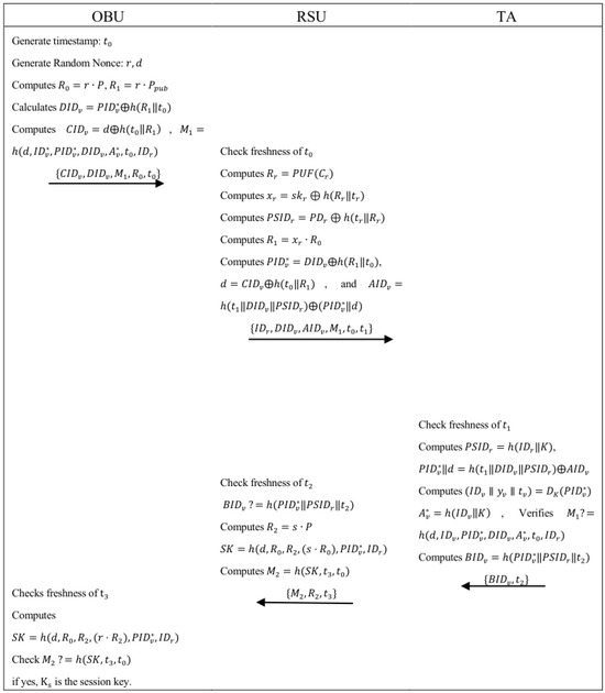 RSU computes and . Subsequently, RSU computes the session key and verifies and . Finally, RSU updates , and transmits to .