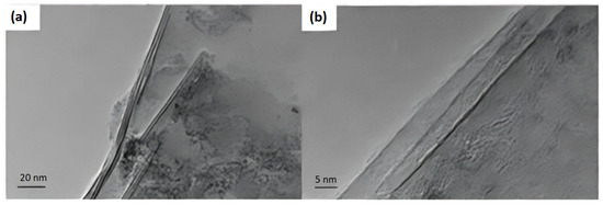 Ti3C2 was obtained after etching of Ti3AlC2 using hydrofluoric acid and lithium fluoride, and the interlayer gaps of the MXene nanosheets were investigated by transmission electron microscopy (TEM) [42]. Based on the image in Figure 1a, it is evident that the nanosheets exhibit nearly transparent properties, allowing for the visibility of individual layers (i.e., Ti and C layers) within a single Ti3C2 sheet. Upon closer inspection in the higher magnification image (Figure 1b), it is estimated that the thickness of a single layer Ti3C2 is approximately 1–2 nm. Given the observed layered morphological structure of MXene, it can be proposed as the “lamella” model.