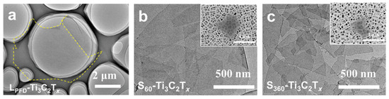 TEM images of (a) LPFD-Ti3C2Tx, (b) S60-Ti3C2Tx (60 s sonication), and (c) S360-Ti3C2Tx (360 s sonication) [44]. Reprinted with permission of Zhang et al. Adv. Sci., copyright (2022), with permission from John Wiley and Sons.