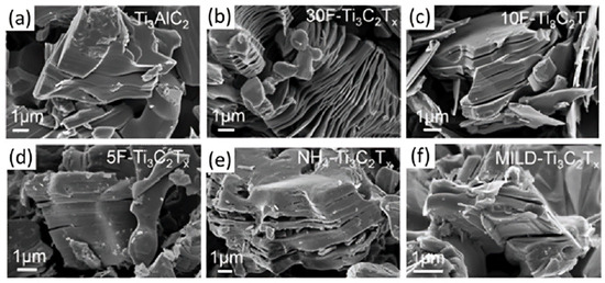 When the initial MXene has been synthesized by immersion into highly concentrated HF, the “accordion” structure is considered indicative of successful synthesis [47]. Nonetheless, this accordion structure, which is synonymous with MXene, does not represent the appearance of all multilayer MXene. In Figure 4, SEM images of multilayer Ti3C2Tx synthesized under various conditions are depicted [48]. As the HF concentration decreases, the “accordion” structure becomes less prominent, and the multilayer MXene more closely resembles the typical MAX structure. Essentially, as the effective HF concentration increases, the production of H2 becomes more rapid, resulting in an expanded structure. Conversely, at lower concentrations (and therefore slower kinetics), there is no morphological change in the particles.