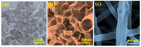 Morphology and structure characterizations of MXene@MF and N–MXene: SEM image of (a) MXene@MF; (b) N–MXene; (c) N–MXene–F [49]. Tao et al., Molecules, copyright (2022), MDPI (open access).