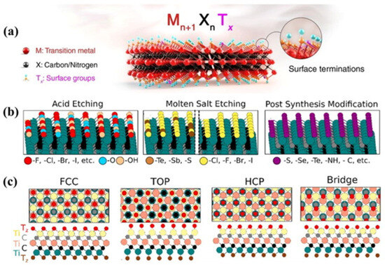MXenes with surface terminations. (a) The terminal groups attached to MXene surfaces; (b) variety and adaptability of MXene terminations on MXene surfaces resulting from the etching of MAX phases; (c) surface terminations located on the surface Ti, HCP sites on the surface, and bridge sites between surface Ti atoms [51].