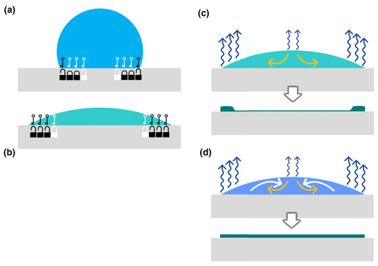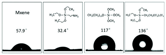 The authors in [54] have reported functionalization of Ti3C2 with silylation reagents ((3-aminopropyl)triethoxysilane (APTES)) to tailor its hydrophilicity. The stability of Ti3C2 was improved by APTES functionalization by blocking the contact between water and MXenes. This improvement was also achieved for hexadecyltrimethoxysilane and 1H,1H,2H,2H–perfluorodecyltriethoxysilane (FOTS) (Figure 8). The results indicated the change in surface properties from hydrophilic to hydrophobic. Two superhydrophobic self-assembled monolayers (SAMs) [(3-chloropropyl)trimethoxysilane (CPTMS)] and FOTS were used for surface modification of MXenes via formation of covalent bonds between –OH and different surface functional groups. The water contact angle findings revealed a superhydrophobicity of 156° and 96° (not shown) for the fluorine-containing (Ti3C2–F) and chlorine-containing (Ti3C2–Cl) films, respectively, whereas the pristine Ti3C2 is inherently hydrophilic due to the presence of –O and –OH functional groups (exhibiting a water contact angle of 33°). Therefore, modifying Ti3C2 with superhydrophobic agents like FOTS and CPTMS could serve as an effective strategy to impede the degradation of MXene materials.