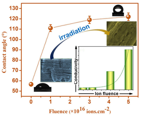 Dependence of the contact angle and conductivity of 2D multi-layered MXene (Ti3C2Tx) vs. ion fluence [56]. Reprinted from S. Patra et al., Surf. Interf., copyright (2023), with permission from Elsevier.