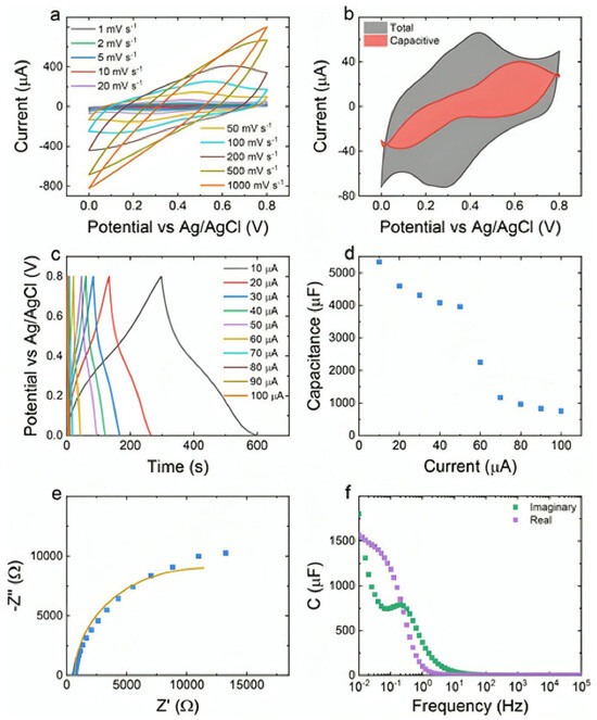 Vahidmohammadi et al. [40] took a step further by synthesizing a Ti3C2Tx MXene composite through in situ polymerization of polyaniline (PANI) on the MXene surface. The composite exhibited volumetric and gravimetric capacitances of 1682 F cm−3 and 503 F g−1, respectively. Moreover, the specific capacitance reached 336 F g−1, with 98.3% capacitance retention after 10,000 cycles.