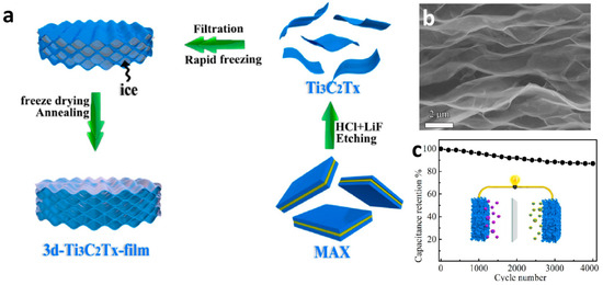 - Wang, Y.M.; Wang, X.; Li, X.L.; Bai, Y.; Xiao, H.H.; Liu, Y.; Liu, R.; Yuan, G.H. Engineering 3D Ion Transport Channels for Flexible MXene Films with Superior Capacitive Performance. Adv. Funct. Mater. 2019, 29, 1900326. [Google Scholar] [CrossRef]