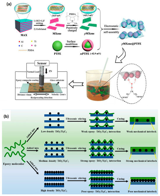 - Yang, Y.; Yang, G.; Hou, K.; Wang, H.; Wang, N.; Yang, S.; Wang, J. Environmentally-Adaptive Epoxy Lubricating Coating Using Self-Assembled PMXene@polytetrafluoroethylene Core-Shell Hybrid as Novel Additive. Carbon 2021, 184, 12–23. [Google Scholar] [CrossRef]