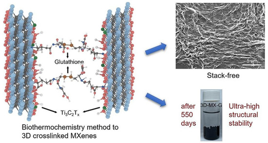- Zhang, H.; He, H.; Huang, Y.; Pu, S.; Xie, Y.; Huang, J.; Jiang, X.; Wang, Y.; Wang, S.; Peng, H.; et al. Simultaneously addressing self-stacking and oxidative degradation issues of Ti3C2Tx MXene through biothermochemistry induced 3D cross-linking. Appl. Surf. Sci. 2023, 639, 158183. [Google Scholar] [CrossRef]