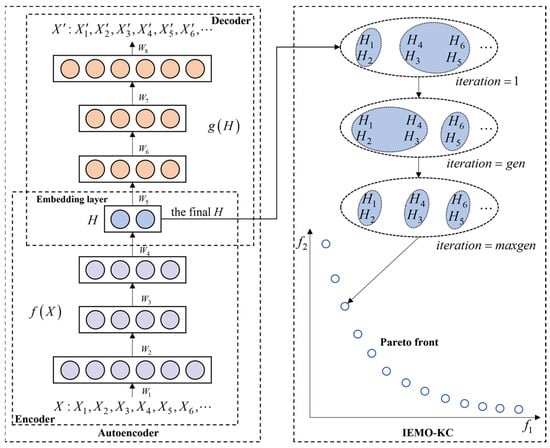 Figure 1 shows the architecture of the proposed AE-IEMOKC, which is established by combining an autoencoder with IEMO-KC. First, the original dataset X is mapped to the low-dimensional embedding layer as the feature representation H of X by the encoder of the autoencoder. Then, H is transformed as the reconstructed data by the decoder of the autoencoder. This process is repeated iteratively to minimize the loss (see Equation (4)). Then, the final H obtained from the embedding layer is divided into different clusters by IEMO-KC. The clusters are constantly adjusted during the continuous iterations of IEMO-KC to minimize the two objectives f1 and f2 (see Equation (5)) for better clustering solutions. A set of optimal non-dominated clustering solutions with different k (Pareto front) can be obtained after the number of generations (gen) reaches the maximum (maxgen). The following subsections provide a detailed introduction to the autoencoder and IEMO-KC.