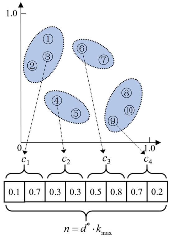 The centroid-based chromosome encoding method is used, where the chromosome is composed of the cluster centroids. To avoid invalid solutions, it is based on valid initialization in this paper. Specifically, different kmax data points in the final H are randomly selected as the cluster centroids and encoded into the chromosome, where kmax is the maximum k, and the default range of k is [2, kmax]. The length of each chromosome is unified as n = d* · kmax. Figure 2 shows the centroid-based chromosome encoding method based on the valid initialization using 10 two-dimensional data points as an example. When kmax is set to 4, four data points are selected as the cluster centroids c = {c1, c2, c3, c4} and encoded into the chromosome. After the initialization, each chromosome is assigned with a random k. If the random k of a chromosome is 2, only (0.1, 0.7, 0.3, 0.3) will be taken as the decision variables of this chromosome.