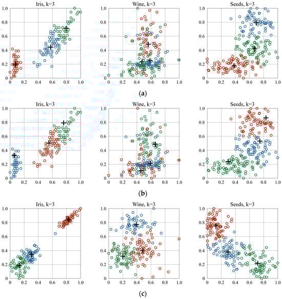 Clustering results obtained by GKA, MOKGA, and AE-IEMOKC on the Iris, Wine, and Seeds datasets when k = 3: (a) The clustering results obtained by GKA (b) The clustering results obtained by MOKGA. (c) The clustering results obtained by AE-IEMOKC.